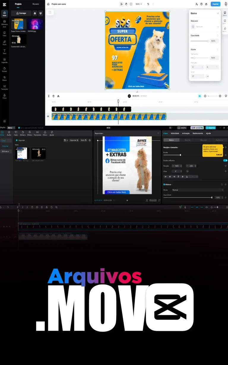 Usamos o CapCut no Pc e também o Canva, mas você pode usar outros editores como after effects e camtasia. Você pode criar sua arte estatica no canva ou photoshop e apos salvar em PNG ou JPG, assim basta subir nos editores de video citados e arrastar seu mascote para a arte, arraste tambémum música e esta tudo pronto.